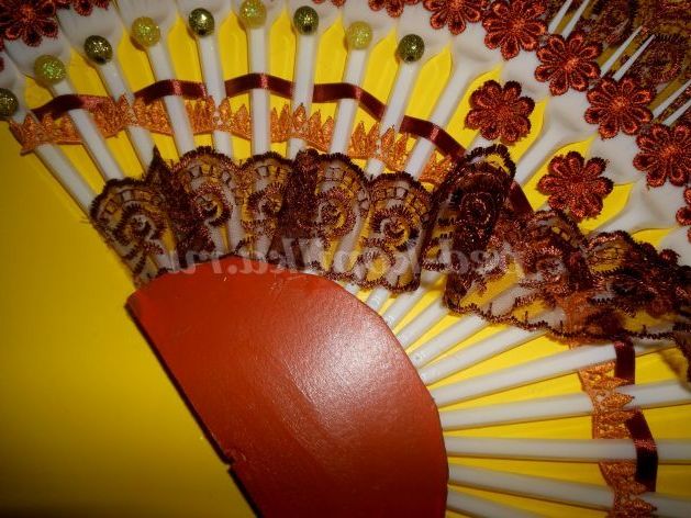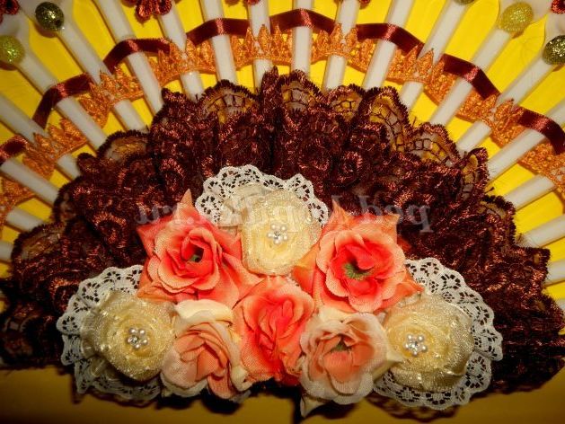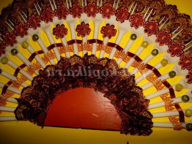Перший етап прикраси завершився, тепер я беру дуже оригінальна прикраса мереживо з квіткових мотивів, можна цілком клеїти, а можна окремо, я буду використовувати і той, і той спосіб. ось таку цілу смужку я приклеїла по верхньому краю віяла вийшло ось так