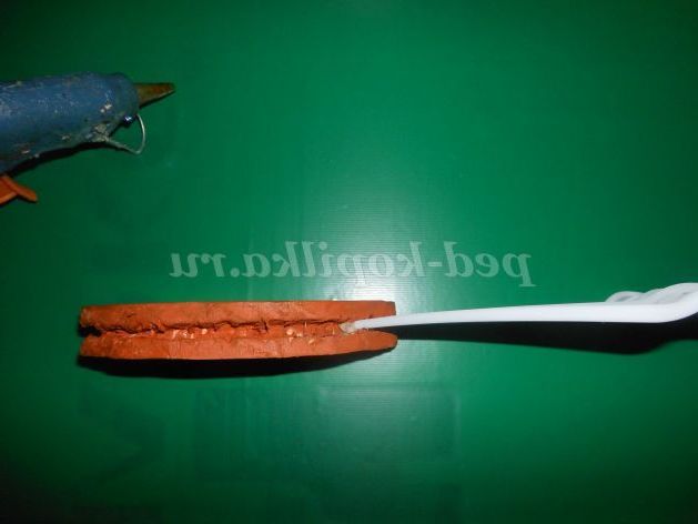 Даємо підсохнути хвилин 30,і готуємо необхідний матеріал для наступного етапу роботи це терма клей, вилки і наша половинка кола, починаємо вставляти в пази вилки, клей наносимо приблизно на 5 вилок, так як він швидко застигає, ось так