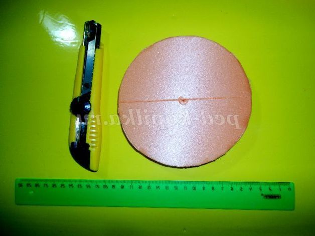 І так, ми беремо шматок пеноплена розміром 15х15,хочу сказати, що це ідеальний матеріал для виробів. Добре ріжеться, фарбується, клеїться, дуже легкий. Заздалегідь приготовленим циркулем відміряємо по лінійці 7см і креслимо коло, як показано на фото, потім канцелярським ножем вирізаємо коло