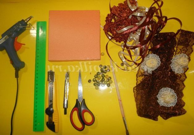 Тепер будемо прикрашати низ, широку стрічку приклеюємо, створюючи складочки