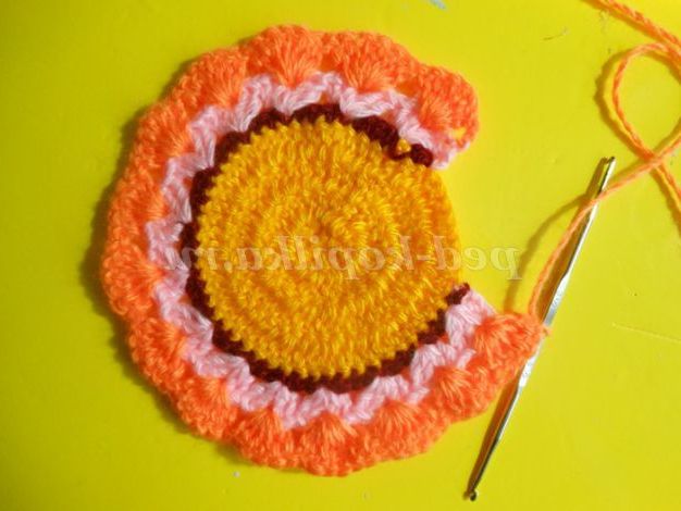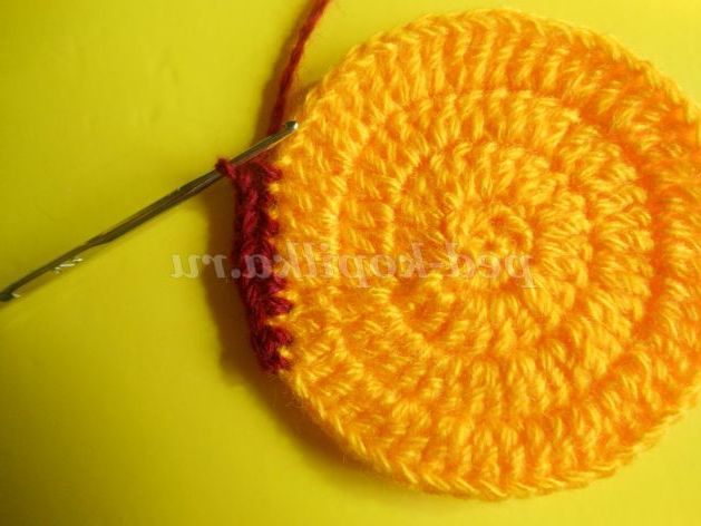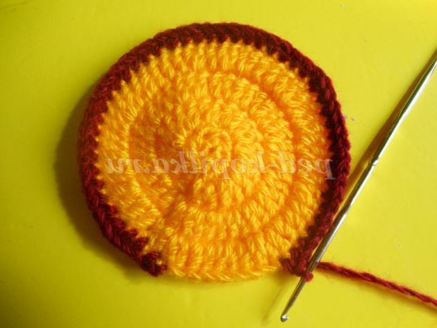 Далі контрастною ниткою пров'язуємо ряд СБН або полустолбиков, 8 петель залишаємо недовязанными, нитка обриваємо. Якщо тулуб ви плануєте в'язати цим же контрастним кольором, то нитка обривати не потрібно, а просто відсуньте поки моток в бік.