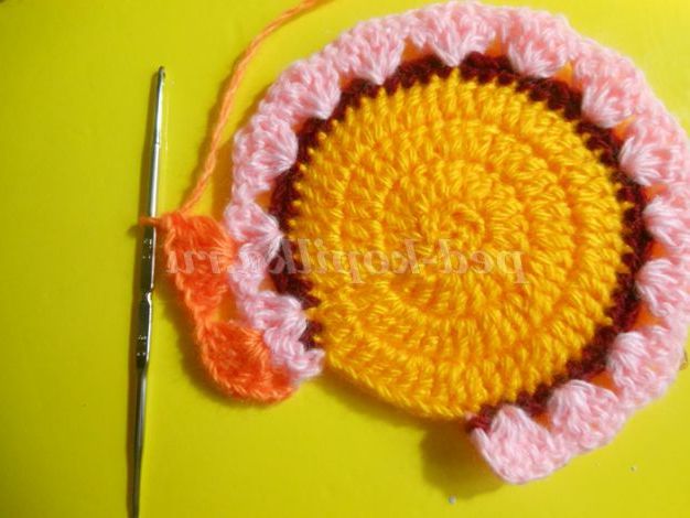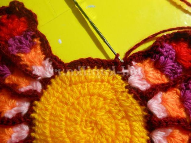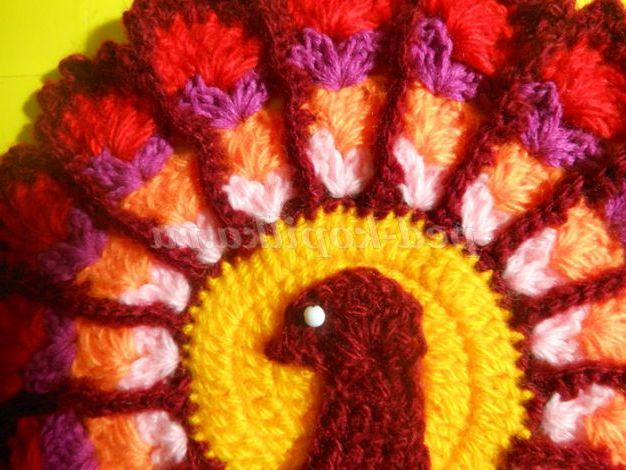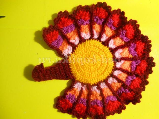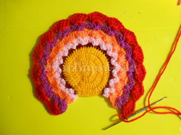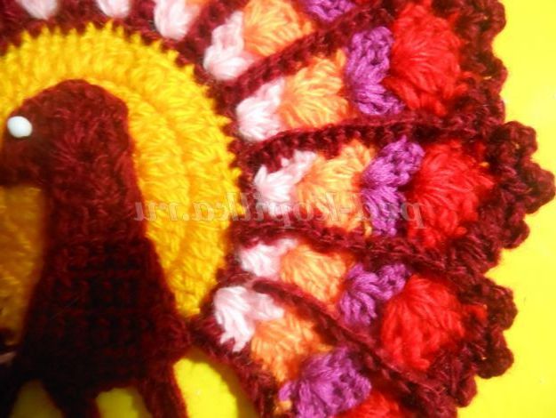 Тепер веерочками ССН в'яжемо хвост.Веерочков повинно бути незліченна количество.В цьому павліні у мене їх 15 штук. Для кожного кольору прикріплювала нову нитку з правого боку, роботу не перевертала. Віялами в'яжіть 4-5 рядів, не більше, інакше прихватки буде величезною.