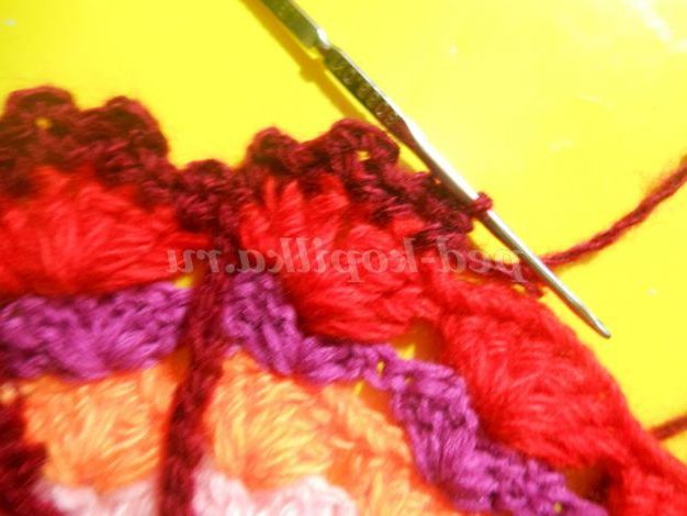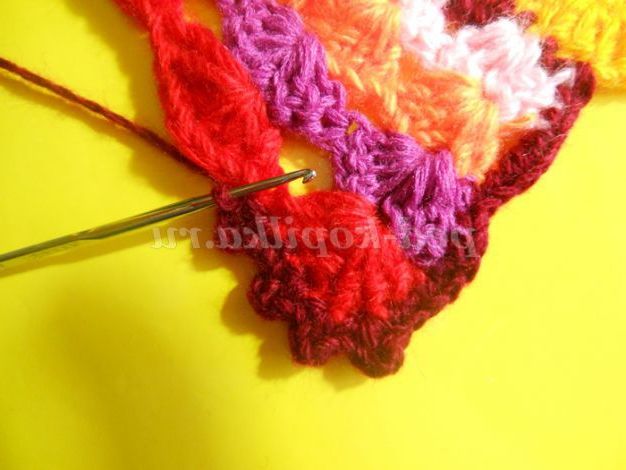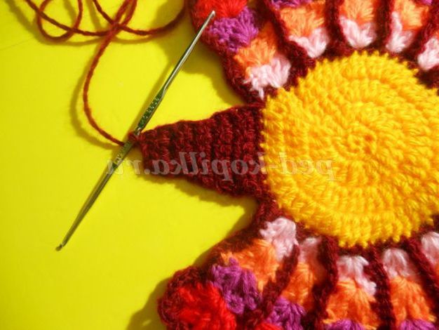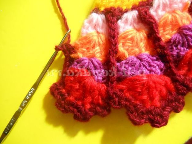 Ясно, що в кожному ряду кількість стовпчиків у кожному віялі треба збільшувати. Як бачите, тут теж немає точних цифр. Залежить від № гачка, товщини нитки. Прикладайте в'язання до плоскої поверхні і стежте, щоб не стягувалось і не фалдилось.Я в'язала гачком 2,5, ниткою середньої товщини.