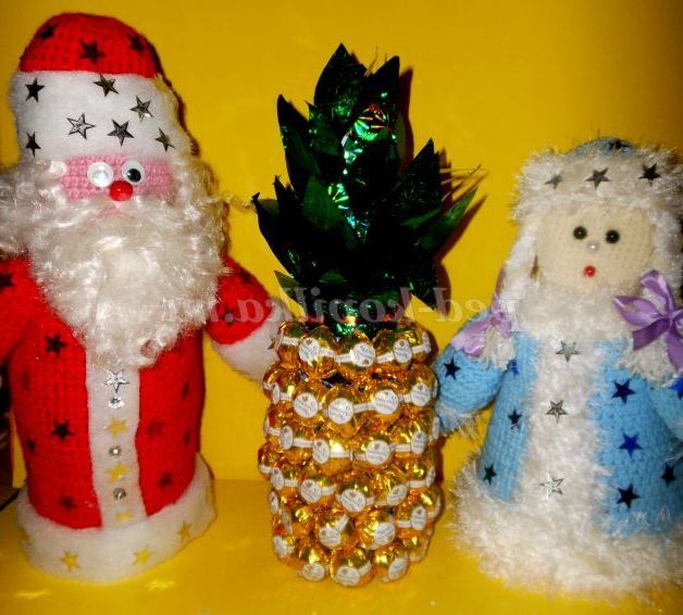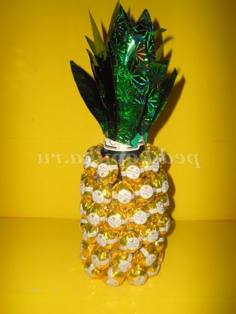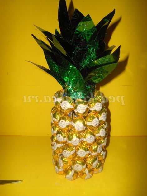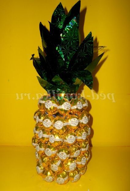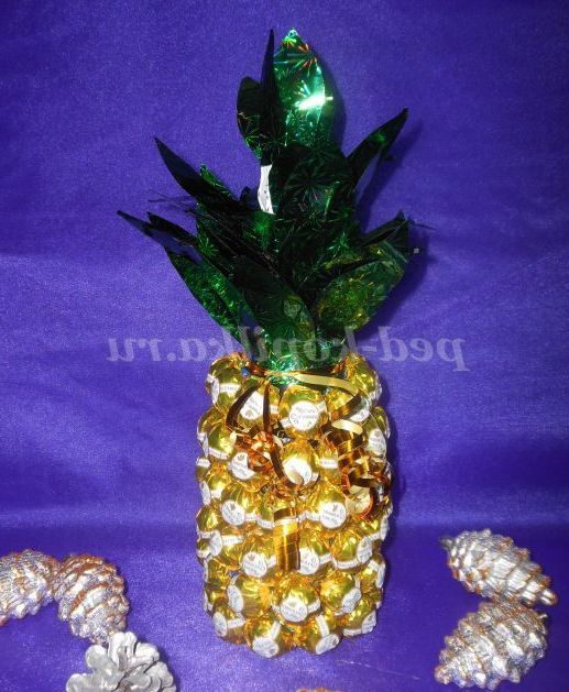 Вже через місяць новий рік. І вже стало традицією, що атрибутом новорічного столу є: пляшка шампанського, мандарини, цукерки і ананас. Ось такий солодкий ананас стане оригінальним і дуже незабутнім подарунком. Треба завжди радувати, незвичайними подарунками своїх друзів і близьких. Виглядає такий ананас дуже красиво і незвично.