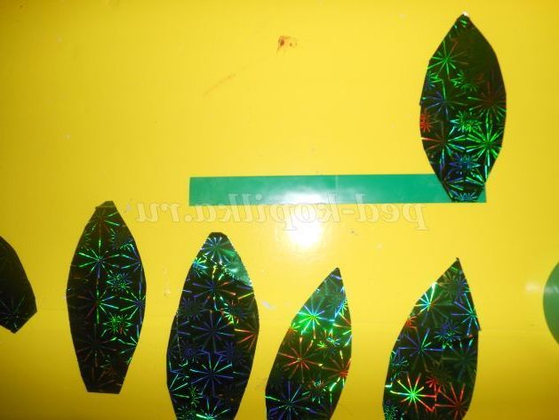 3. Далі листочки на ананас, матеріал може бути різноманітний, у мене під рукою опинилася клейова плівка, я нарізала на смуги, прибрала захисний папір і склеїла між собою
