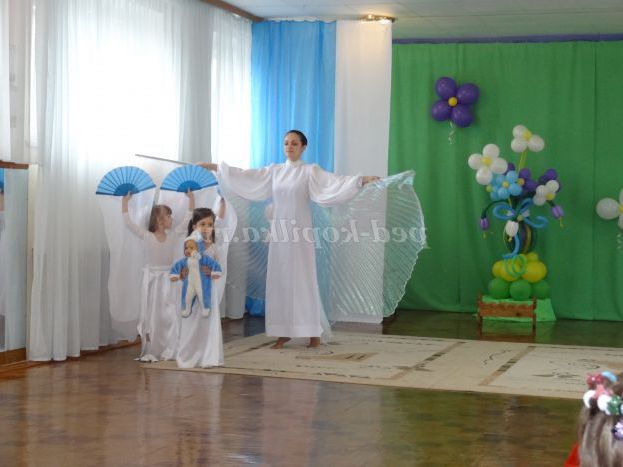 Обладнання: 4 віяла, 1 білі крила для дорослого, люлька-качалка, малюк-пупс, хустки, шкарпетки , рукавиці, мікрофон, ширма - декорація для інсценування, квіти - подарунки, вази.