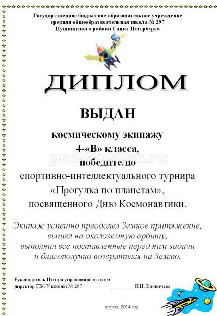 ![]() День космонавтики в 4 класі. СценарийСпортивно-інтелектуальний турнір «Прогулянка по планетах», присвячений ДНЮ КОСМОНАВТИКИ«Чекають нас швидкі ракети