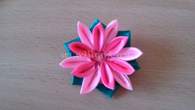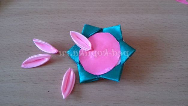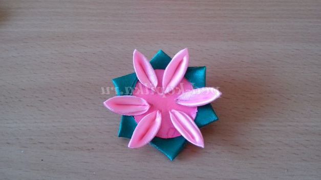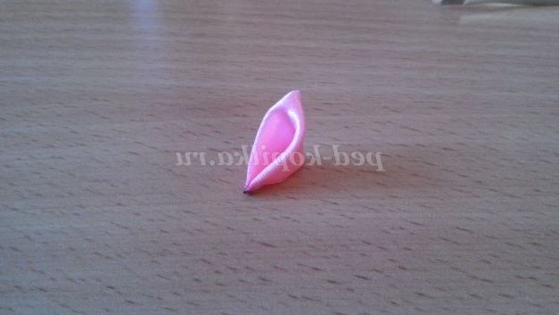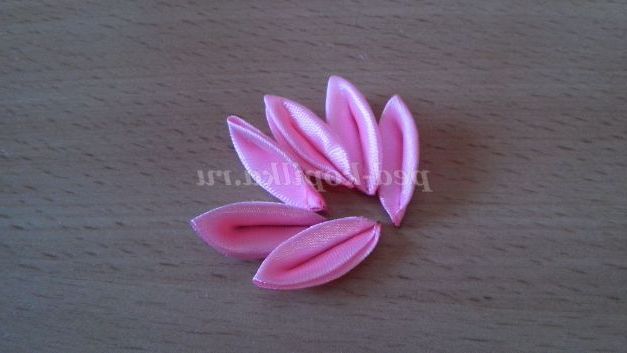 14)Аналогічно робимо 6 пелюсток з темно-рожевої стрічки.
