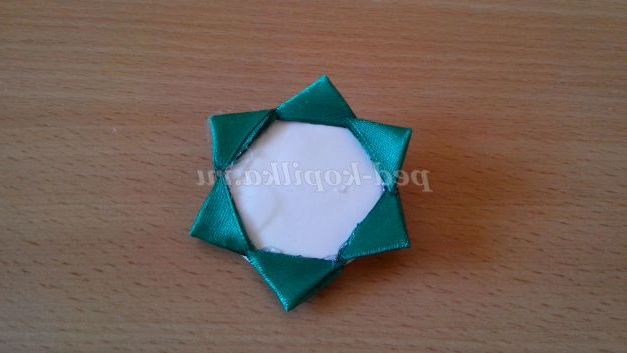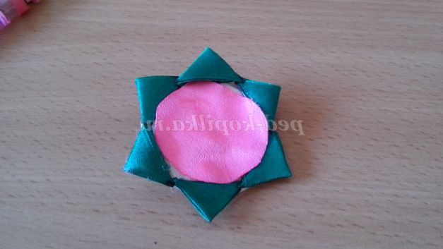 21)У уникнення білих просвітів, приклеюємо коло з рожевої стрічки на нашу основу брошки.