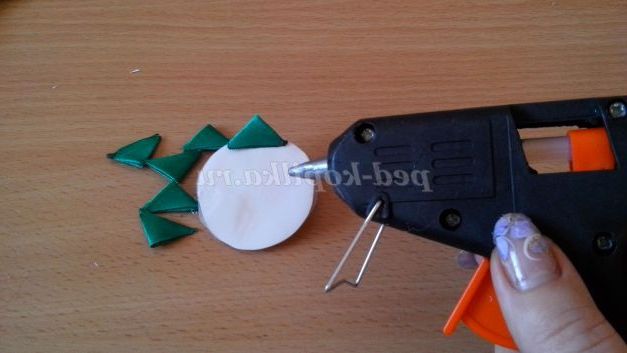 16)Приступаємо до виготовлення листочків. Беремо зелені квадратики і робимо кроки 6,7 і 8. У нас виходить трикутник.