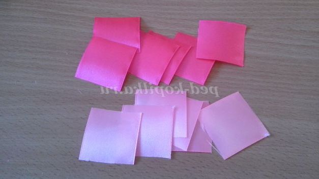 1)Беремо рожеві стрічки і відрізаємо квадрати 4х4 сантиметри. За 6 квадратів від кожної рожевої стрічки.