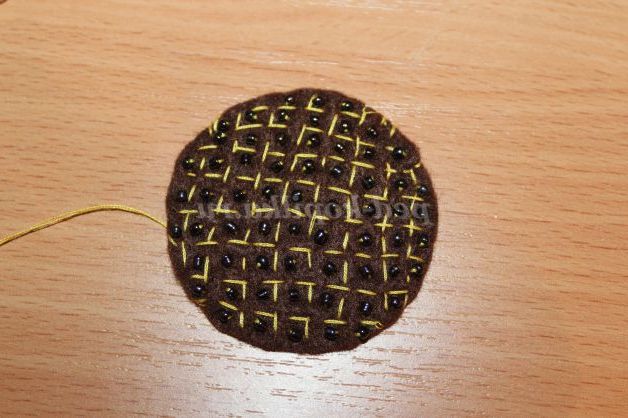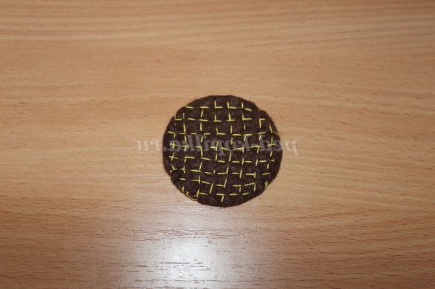3)Тепер на темно-коричневою деталі вишиваємо жовтими нитками сіточку. Жовтою ниткою стібками робимо спочатку горизонтальні, а потім вертикальні смуги.