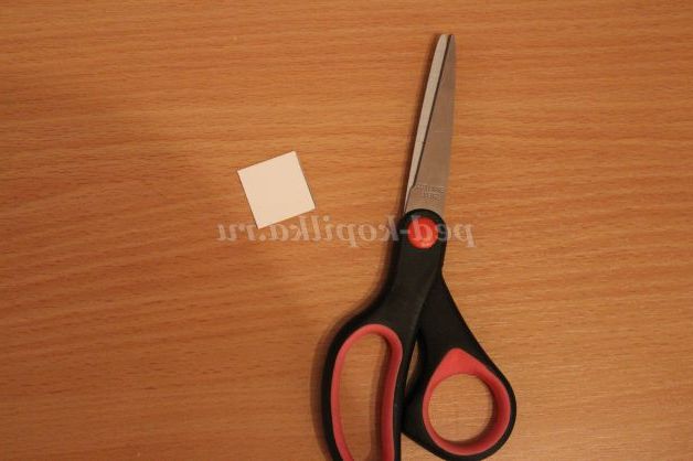 8)Приступаємо до виготовлення пелюсток. Робимо шаблон. З картону вирізаємо квадрат 2,5 Х 2,5 см. Два верхніх кута плавно зрізаємо.