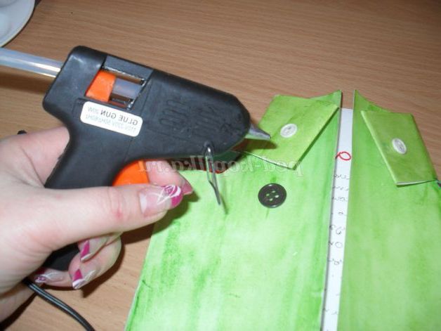 15)Приклеюємо гудзички на воротнічок. Для того ,що б краватку кріпився зручніше я зробила "ніжку" з маленької білої гудзики. Тобто спочатку приклеюємо маленьку катю,як основу,а на неї вже нашу велику гудзик