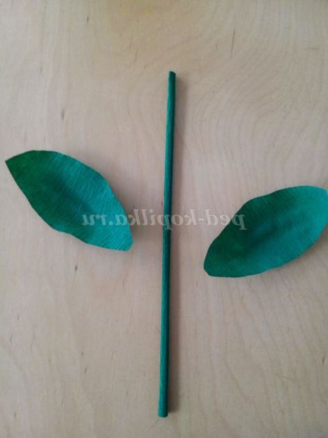 9) Загортаємо паличку в папір,заклеюючи край. Вирізаємо листочки і приклеюємо до среблю.
