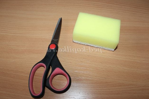 13)Беремо губку для миття посуду і по середині робимо дірочку.