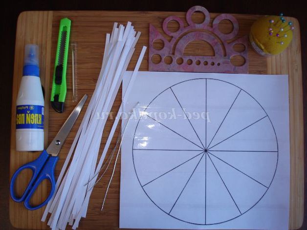 Матеріал для роботи: для роботи знадобиться білий офісний папір, розрізана на смуги шириною 5 мм і довжиною 30 см., ножиці, клей ПВА, лінійка трафарет з формами коло, зубочистка, канцелярський ніж, дерев'яна дошка, роздрукований і ламінований скотчем шаблон з променями, голки для наметывания, нитка для ялинкових іграшок.