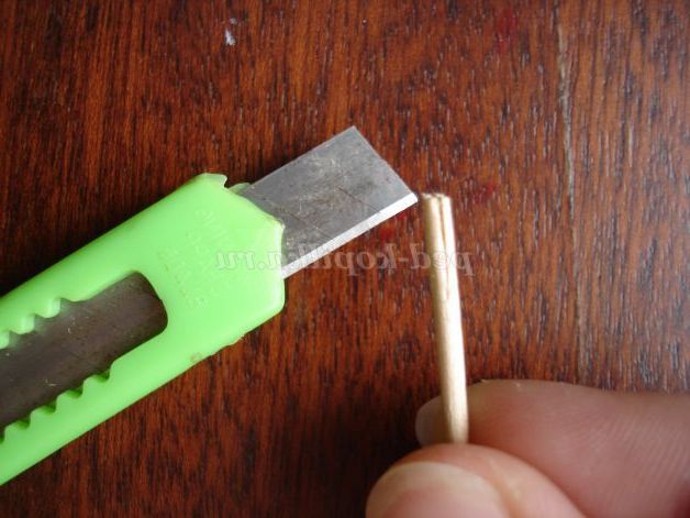 Для початку підготуйте інструмент для накручування паперових смуг: візьміть зубочистку, відріжте канцелярським ножем гострий кінчик і зробіть ущелину завглибшки 5 - 6 мм.