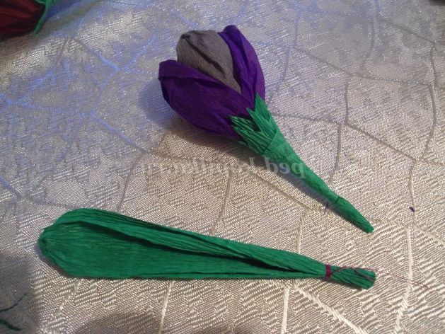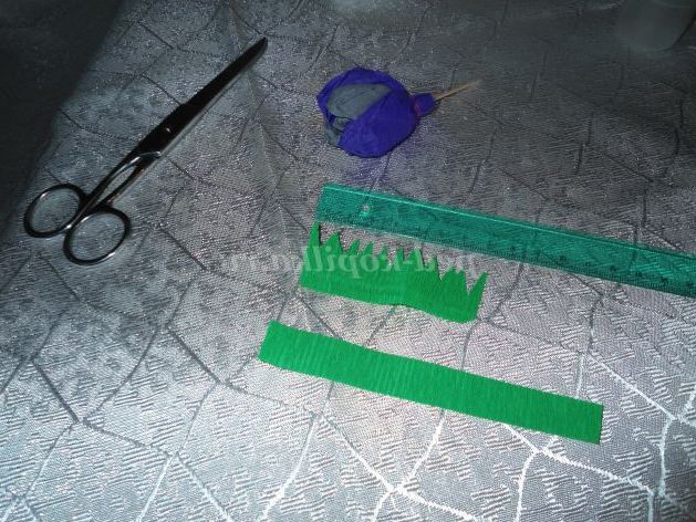 У отриманого бутона квітки необхідно доопрацювати ніжку. Для цього, беремо папір зеленого кольору і ріжемо на прямокутники розміром 2*12см. і 3,5*7см.