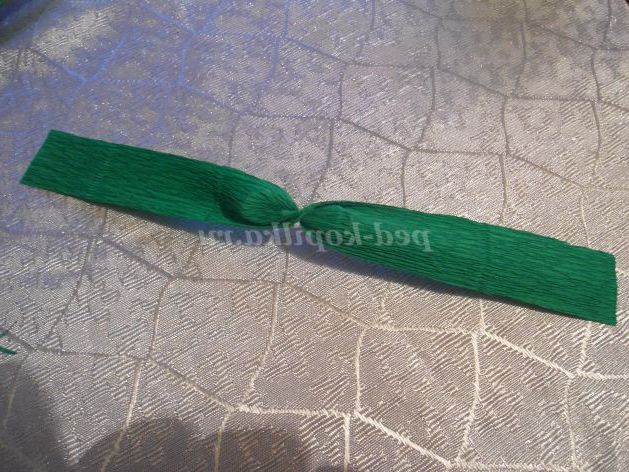 Далі необхідно змайструвати листок для квітки. Відрізаємо від шматка зеленого паперу смужку шириною 2см. і довжиною 20см. При необхідності, можна збільшити довжину, все залежить від того,який результат хочете отримати. Смужку, так само, як і при виготовленні бутона квітки, скручуємо посередині і складаємо навпіл - пальцями надаємо форму листочка, кінчики закріплюють ниткою, щоб листок не розвернувся.