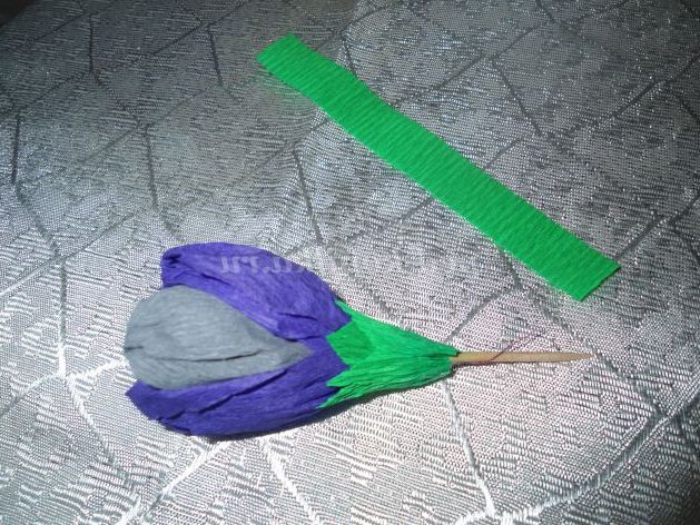 Довгим прямокутником, попередньо змащену клеєм, обертаємо зубочистку-ніжку квітки. Вийшов квіточку.