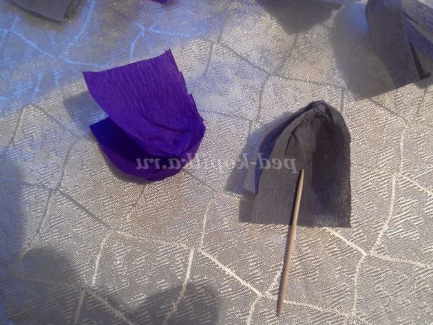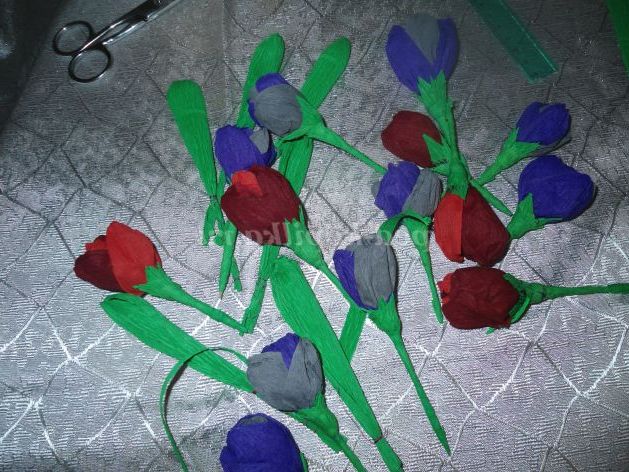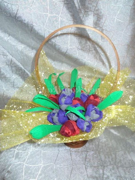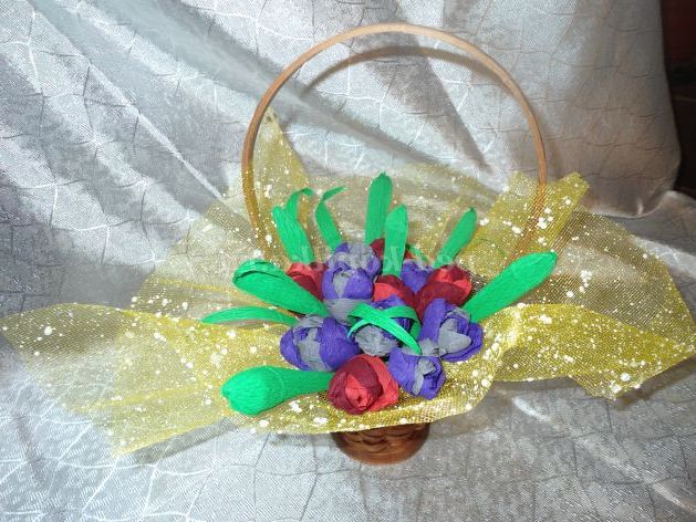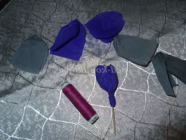 Матеріали: крепований папір фіолетового, сірого, бордового, червоного і зеленого кольорів, клей ПВА, ножиці, зубочистки, нитки звичайні;для оформлення: корзинка, сітка від букета квітів будь-якого кольору.