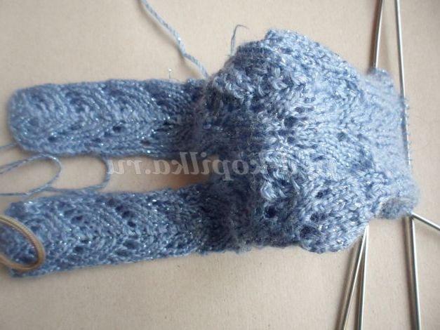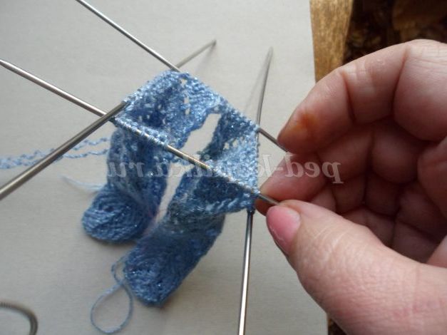 В'яжемо на 3 спицях 1 візерунок , починаючи з «Подвійного зменшення» (у ньому буде провязываться 1 петля і 1 надівається на провязанную); і прибираючи на середній спиці в кожному непарному ряду по 1 петлі в середині( забереться 4 петлі).Провязываем ще 2 візерунка, добираємо петлі на одержані боках і переходимо на вязання на 4 спицях (при в'язанні по колу парні ряди в'яжуться лицьовими ).На кожній спиці по 12 петель ( зайві петлі прибираємо на початку кожної спиці). Далі на спицях - боках і черевці в'яжемо візерунок + перша і остання петлі лицьові, а візерунок на спиці-спині починається і закінчується Подвійним зменшенням». Пров'язуємо 4 візерунка