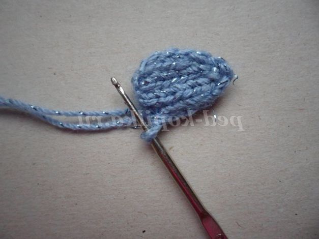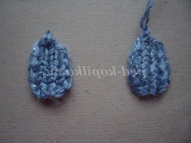 Для в'язання 1 деталі потрібно набрати 7 петель і пров'язати 8 рядів ( непарні ряди пров'язати лицьовими петлями, парні - виворітними),роблячи зменшення в 5 і 7 рядах по 1 петлі на початку і кінці ряду. У 8 ряду закрити 1 петлю