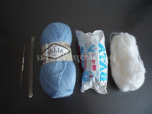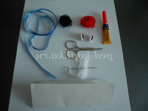 пряжа блакитна акрил, металік , пряжа біла, вата, пряжа червона (рот), пряжа чорна (ніздрі), синя стрічка, очі ,спиці, гачок, ножиці, голка, клей «Моментальний», смужка картону.