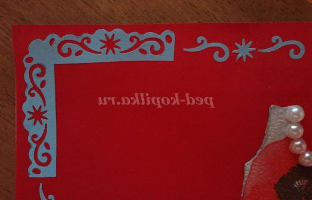 З допомогою фігурного діркопробивача робимо на кольоровому папері фігурні вирізи, приклеюємо на куточок листівки смужки паперу з фігурним візерунком, з залишків робимо прикраси по краю листівки.