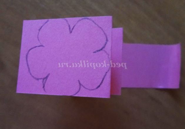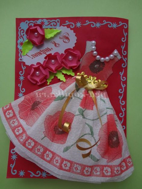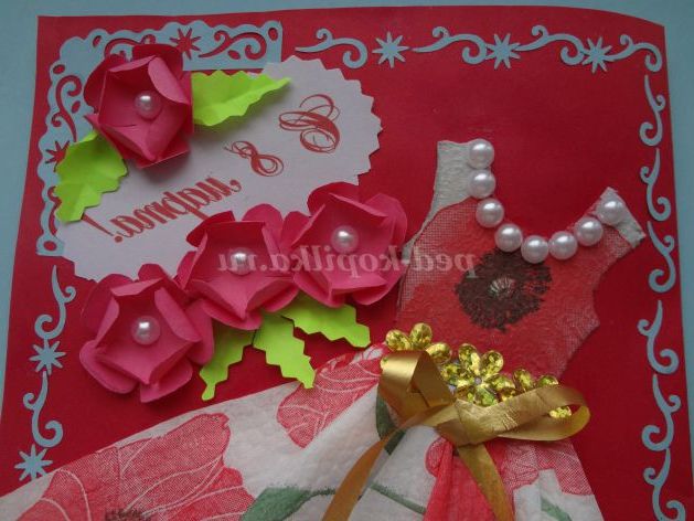 Наклеюємо на листівку. Прикрашаємо плаття напів-намистинами, паєтками. Складаємо папір рожевого кольору гармошкою, обводимо шаблон квіточки,