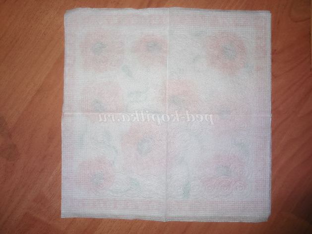 Розгортаємо кольорову серветку, виворітною стороною вгору, на неї накладаємо серветку білого кольору, поєднуємо краї серветок.