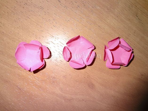 трохи закручуємо пелюстки квіточок, накладаємо один квітка на інший, склеюємо їх між собою, всередину квіточки приклеюємо полубусину
