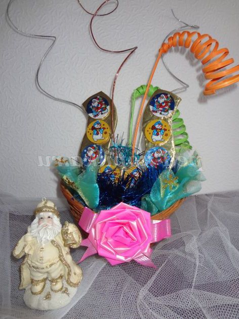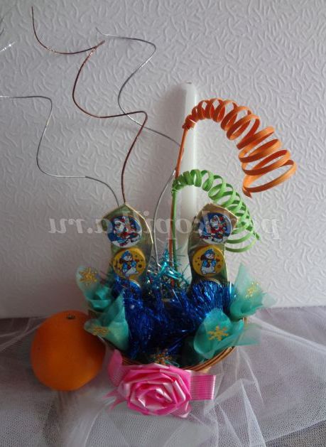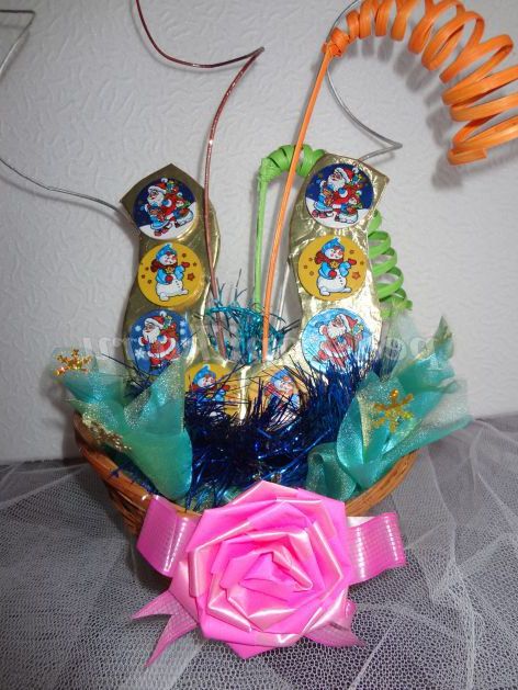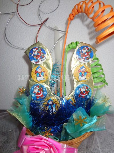 Вставляємо отримані деталі в кошичок або пінопласт. Прикрашаємо сніжинками-паєтками. Декоруємо кошичок по своєму смаку новорічним декором.