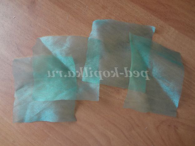 Починаємо прикрашати кошик або ,якщо немає кошички, можна обклеїти кольоровим папером шматочок пінопласту. Вкладаємо всередину кошики клапоть органзи, зверху вставляємо підкову.