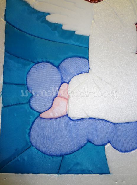 Заповнюємо весь малюнок кольоровими клаптиками. Фон вироби заповнюємо шматками однотонної тканини, роблячи прорізи в плитці довільно.