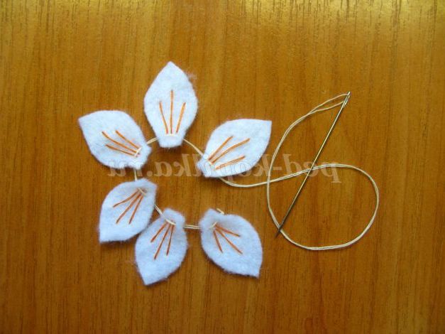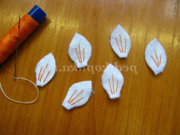З паперу вирізаємо невеликий шаблон у формі пелюстки. Переводимо його на білий фетр (6 шт) і вирізаємо.