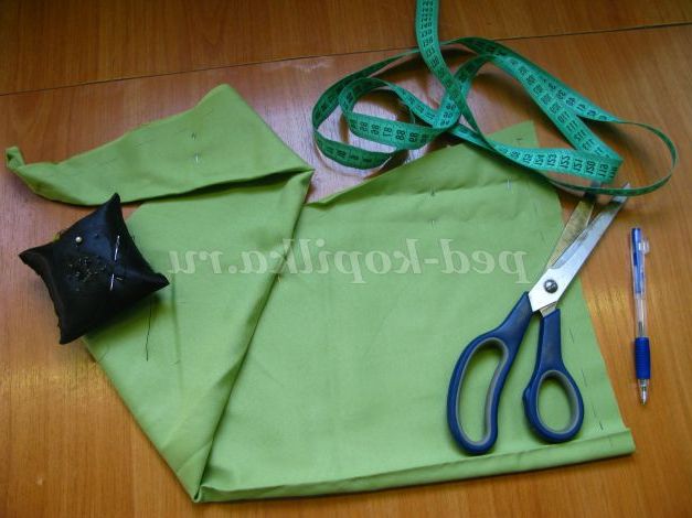 2) Складаємо зелену тканину навпіл. Сантиметром відкладаємо 80 см (40*2=80) від краю з тієї сторони, де у нас згин тканини. Ставимо крапку. Від якої, під прямим кутом, відкладає 50 див. і ставимо крапку. Потім з'єднуємо точки. Вийшов трикутник. Складаємо шпильками і вирізаємо нашу викрійку з припуском 1см.