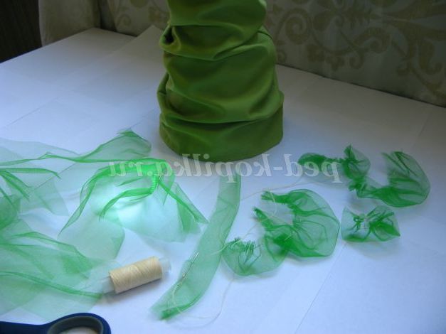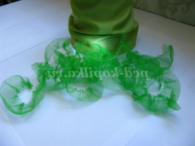5) Нам необхідно підготувати з сіточки кілька спідничок. Для цього нарізаємо смужки з сіточки шириною 6см. і довжиною 15-20см. Складаємо їх навпіл. Нанизуємо на нитку і злегка присбориваем.