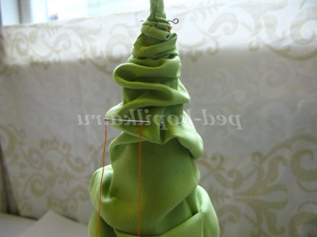 6) Повернемося до нашої ялинки. Беремо помаранчеві нитки і прошиваємо складочки на ялинці. Поступово, спускаючись вниз, підшиваємо під складочку наші спіднички з сітки.