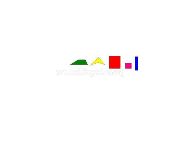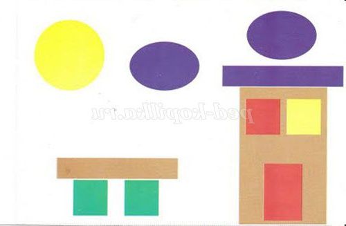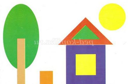 - Маша і ведмідь пропонують скласти картинки з геометричних фігур за готовим картками. Для цього ми розділимося на дві групи. Кожна група буде складати свою картинку. Але спочатку уважно розглянемо картки. Назвіть геометричні фігури, з яких складені картинки. Скільки всього фігур? Якого кольору фігури? Спочатку потрібно скласти картинку, дивлячись на картку, а потім по пам'яті.