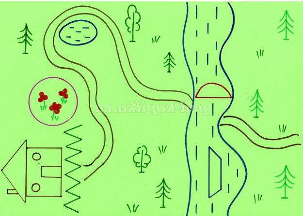 - Діти, Маші і Ведмедя дуже сподобалося, як ви сьогодні працювали на занятті. Вони для вас приготували сюрприз. А зараз їм потрібно вирушати у зворотний шлях. Але наші герої забули дорогу. Давайте їм допоможемо дістатися до будинку. А допоможе нам у цьому карта, на якій об'єкти зображені геометричними фігурами.