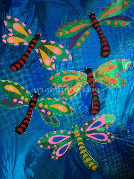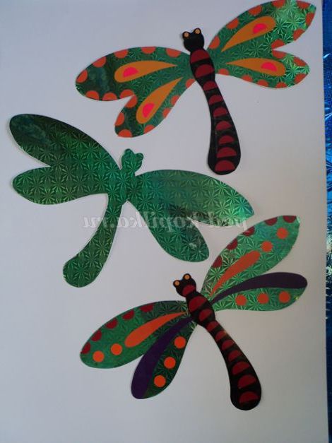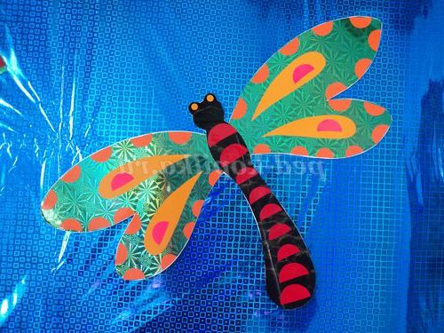 З кольорової плівки,виріжте намальовані деталі для прикраси бабок, розкладіть їх всередині моделі бабки,закріпіть клеєм. Прикраси деталей можуть бути найрізноманітнішими, залежить від фантазії.