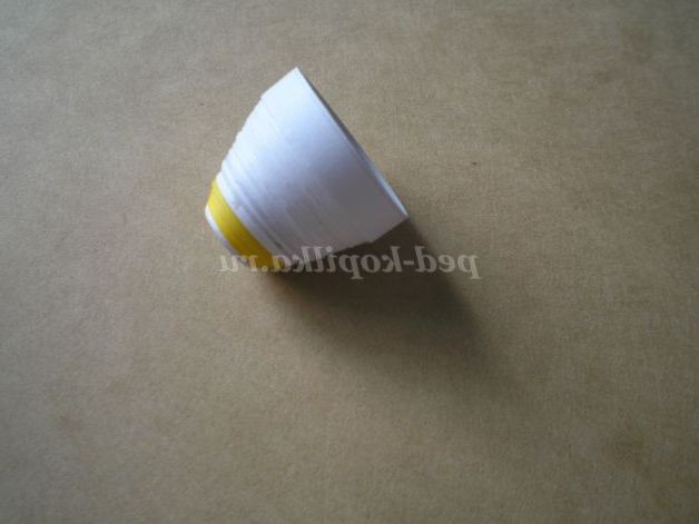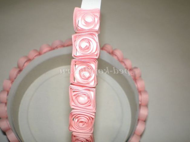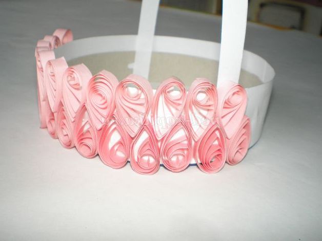 І приклеюємо за допомогою клею ПВА кожен елемент до кошичку. У своїй роботі використовувала кольорову папір світлого і темного відтінку рожевого кольору.