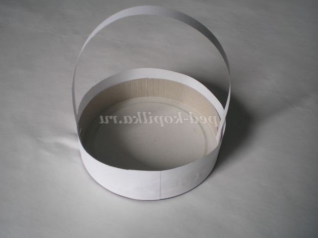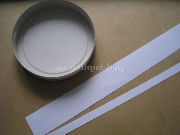 Тепер ми зробимо великодній кошик для наших яєць. За основу кошики беремо круглу коробочку з-під сиру. Відрізаємо дві смужки паперу 1см і 3 див.