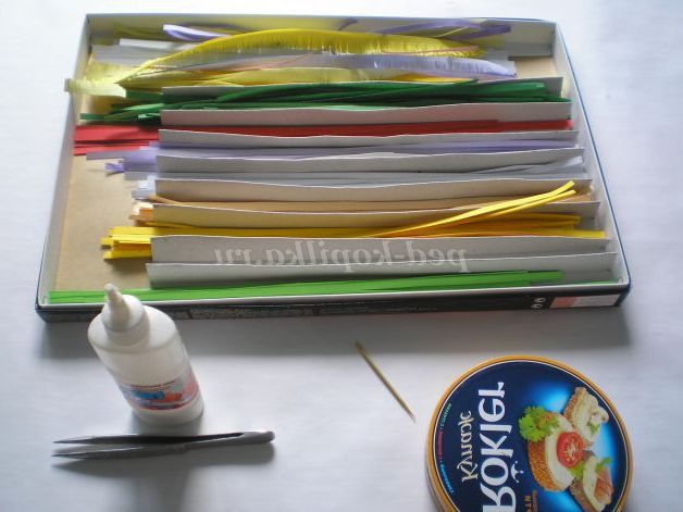 смужки кольорового паперу для квілінгу, або нарізати з кольорового паперу, я нарізала смужки з кольорового паперу шириною 0,5 см;