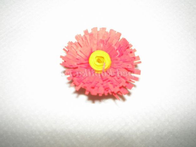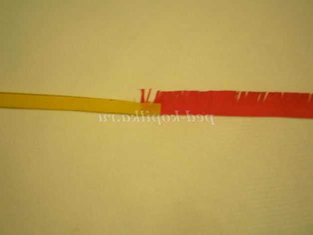 Беремо смужку паперу шириною 1см,нарізаємо бахрому ножицями не доходячи до краю 0,3см. Потім склеюємо дві смуги: одна 0. 5 см, а другу 1см(яку нарізали).
