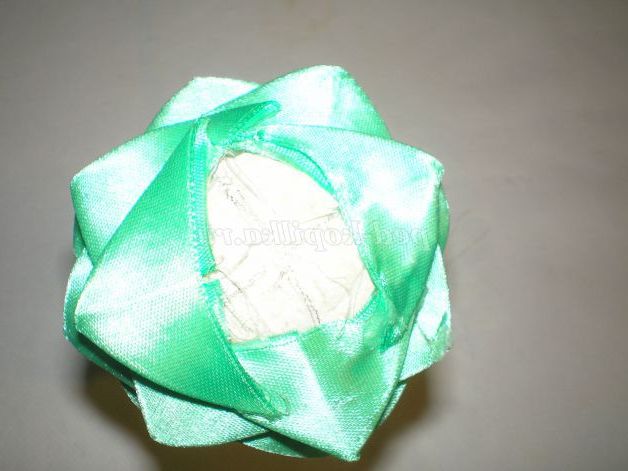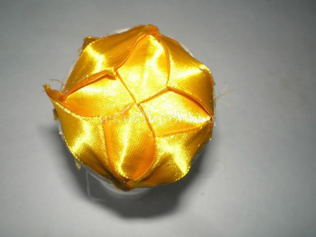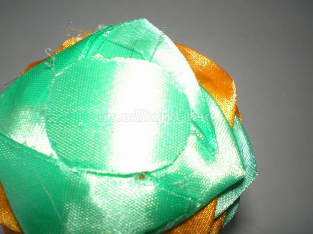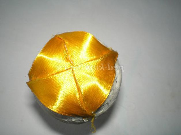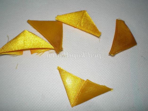 Тепер беремо атласну стрічку жовтого кольору нарізаємо смужки приблизно три сантиметри, і звертаємо з них куточки. Для зручності, щоб куточки не розгорталися, проглаживаю праскою.
