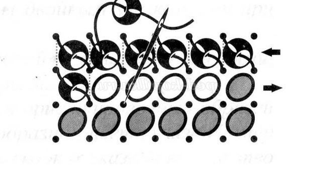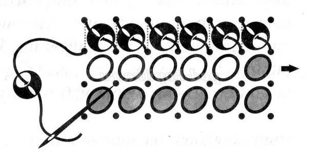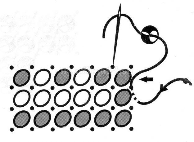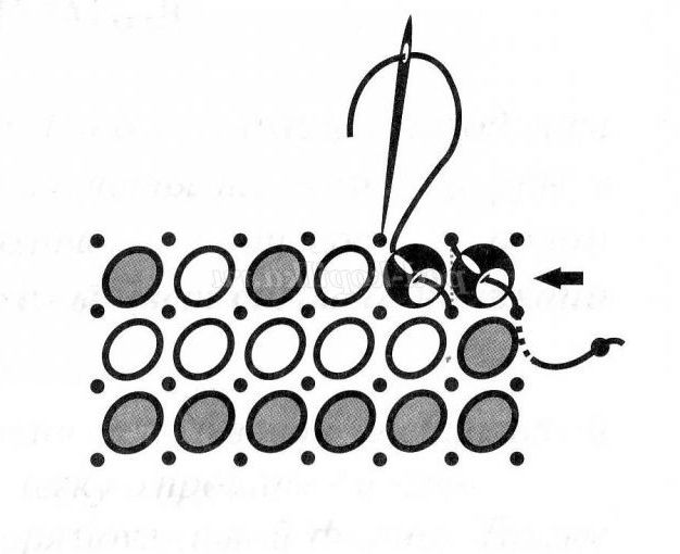 3. Закінчивши перший ряд, спускаємося на другий. У цьому випадку голка виходить з правої верхньої точки, а входить у ліву нижню точку (рис.3-4).