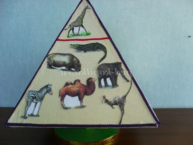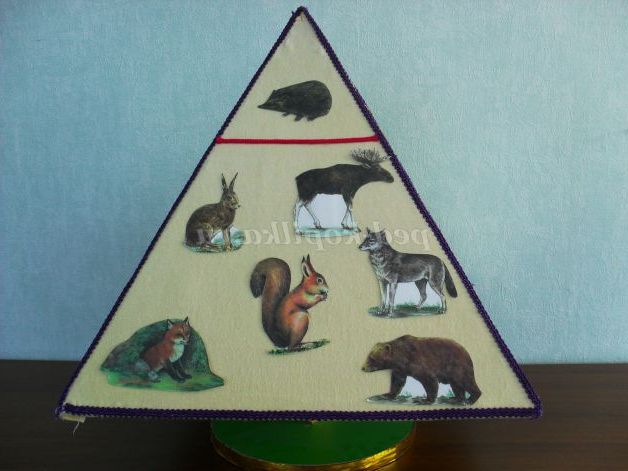 У верхній частині граней піраміди педагог поміщає сигнальну картинку і пропонує дитині розподілити картинки за видовим приладдя. Наприклад: на одній грані дитина повинна розмістити домашніх тварин, на другий диких тварин наших лісів, на третій диких тварин жарких країн, на четвертій диких тварин півночі.